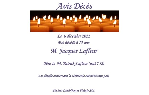 0-DécèsFiducieSyndicat / ApplicationTVVie Syndicale2021-12-06 AVIS DE DÉCÈS DU PÈRE DE PATRICK LAFLEUR Vous devez être connecté pour accéder à cette page. 6 décembre 2021Lire la suite